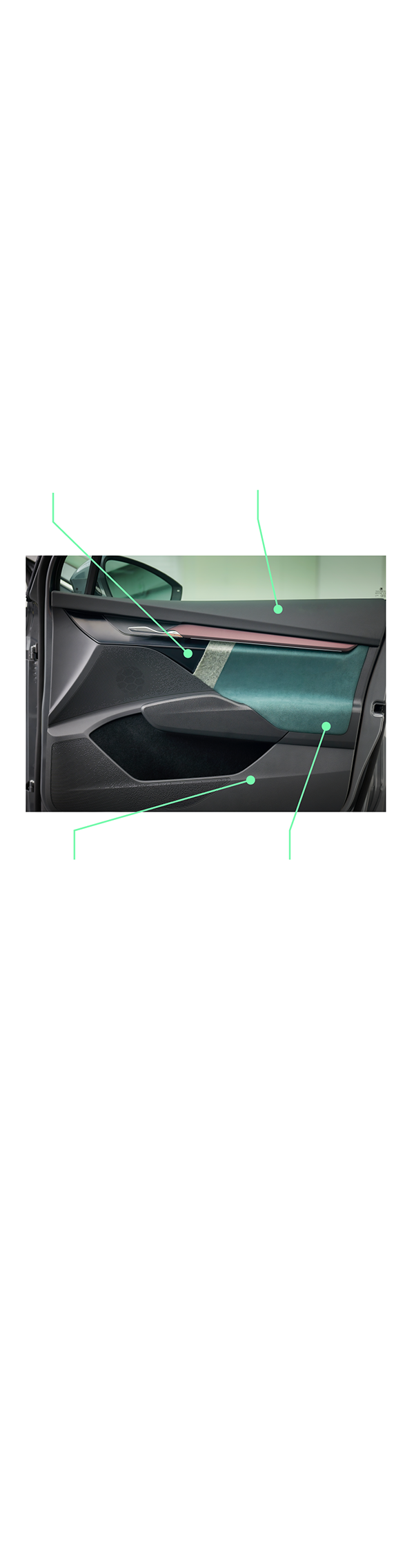 The 2023 IVET show car’s door panels feature inserts and upper sections made from ABS, which comes from offcuts and remnants of the plastic production process. The core structure of the door is formed from polypropylene derived from recycled plastic. This process involves breaking down plastic waste, cleaning it, and reforming it into usable granulate. These plastics, which would otherwise have been incinerated or sent to landfill, now constitute 30% of the door inserts.