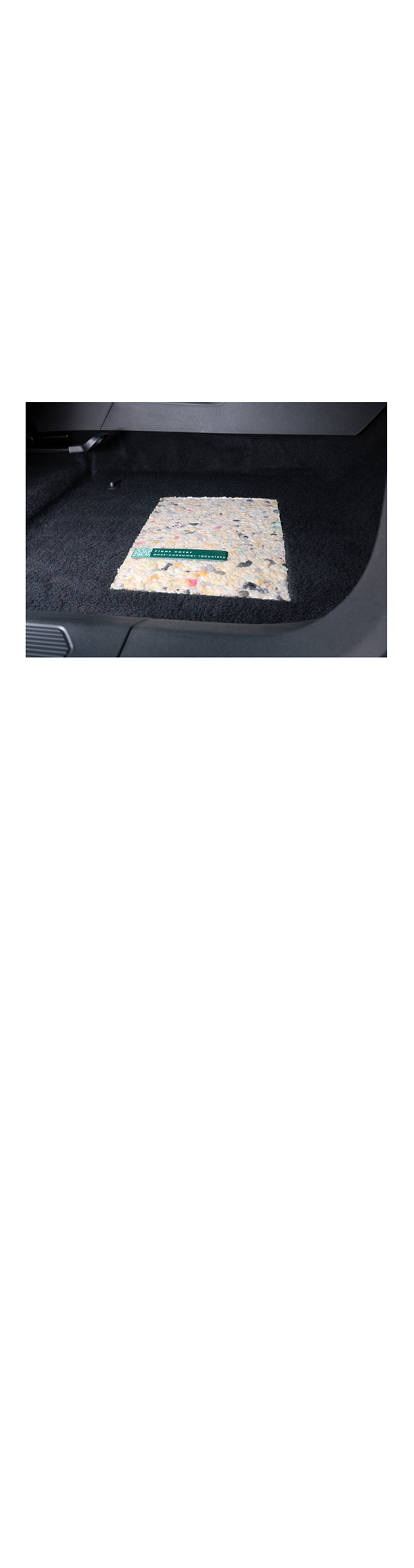 The floor covering of the 2023 IVET show car is made from repurposed polyurethane (PUR) mattresses, collected from households and hotels. Having been thoroughly steam-cleaned, these post-consumer mattresses are cut into small pieces called Greenflocks, which are then combined with a polyester (PES) binder and shaped under pressure into the final product. This method not only innovatively reuses consumer waste but also ensures that the floor covering can be fully reprocessed at the end of its lifecycle.