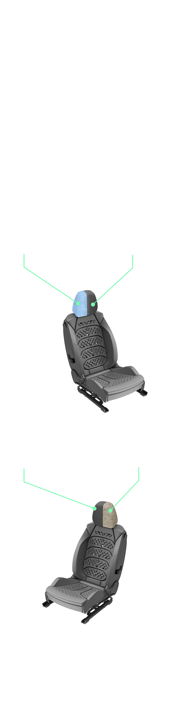 In the 2023 IVET show car, sustainability takes the front seat. The headrests use recycled polyester (PES) fibres derived from PET bottles instead of traditional polyurethane (PUR) foam. These headrests are designed with a mono-material fabric for the exterior, composed of 100% recycled PET fibres, and the entire unit is fully recyclable. In line with the closed-loop principle, the headrests can be transformed into new polyester fibres and auto parts after their lifecycle. Fibres from certified sheep’s wool represent an alternative filling for the headrests. Also using mono-material technology for the outer fabric, these headrests support environmental stewardship, combining recycled materials with the sustainable use of natural resources.